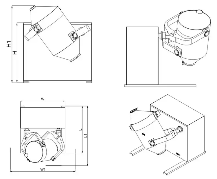 • 混料器具有三维运动,从而使物料在流动,剪切,平移,扩散的作用下,使其由集聚到分散状态并完成互相掺杂的过程,保证了物料混合均匀,均匀度可达99.9%以上。普通混合机,物料在容器内只作分合的简单运动,效率低,混合质量差;