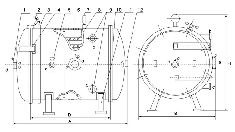 7 温度计 8 烘架 9 进出热水口法兰 10 箱体 11 腿 12 铭牌